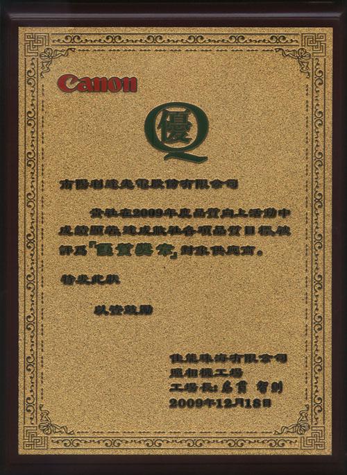 ??????? 12月18日,公司在佳能的供應(yīng)商“優(yōu)質(zhì)獎?wù)隆北碚脙x式上受到表彰,并由佳能島貫工廠長頒發(fā)了優(yōu)質(zhì)獎?wù)伦C書。