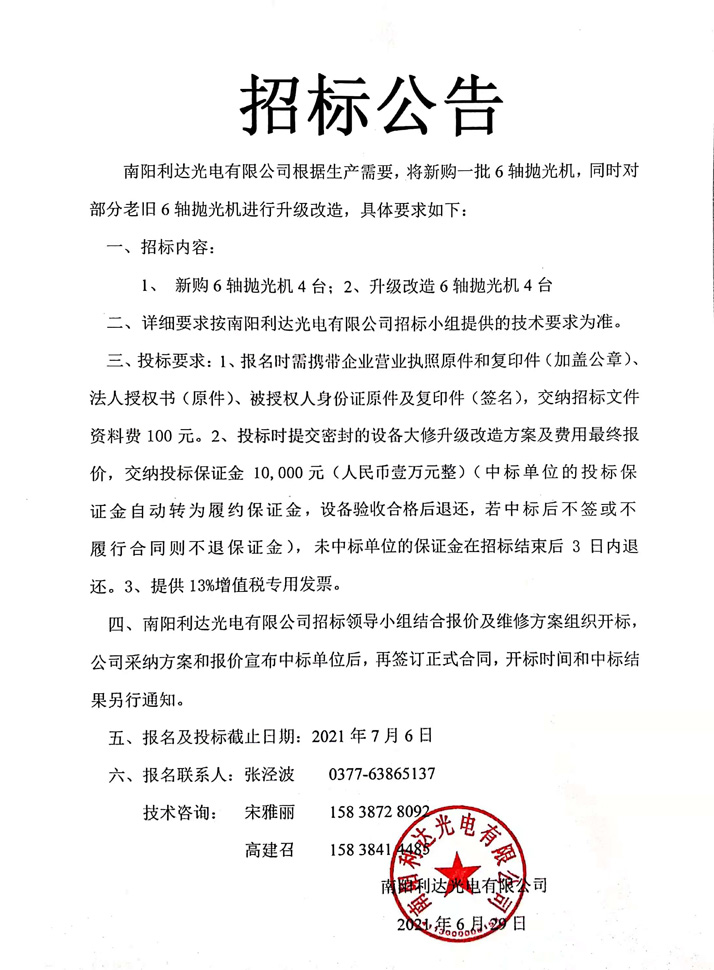 棱鏡事業(yè)部新購及升級(jí)改造6軸拋光機(jī)招標(biāo)