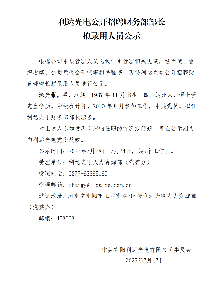 - (2025-07-17)利達(dá)光電公開招聘財(cái)務(wù)部部長擬錄用人員公示